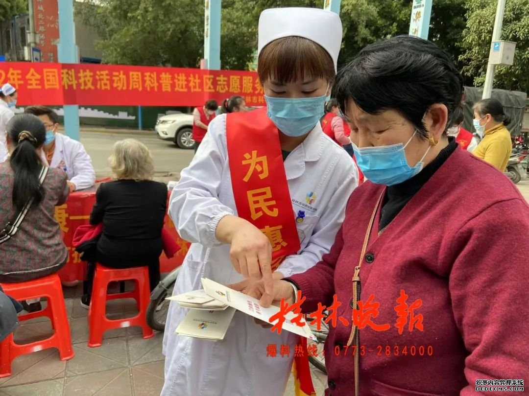 图为:桂林市科技局机关党员志愿者向七星区辰山社区居民宣传疫情防控、食品安全、安全用电、预防一氧化碳中毒等知识。该局还邀请了桂林市第五人民医院的医生,为社区居民免费量血压测心率,并提供基础的健康保健咨询服务。(记者胡逢超 摄)